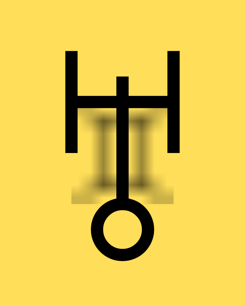 - The glyph for the planet Uranus in front of the glyph for the sign Gemini with a yellow backdrop. Photo by Mad Sage Astrology.