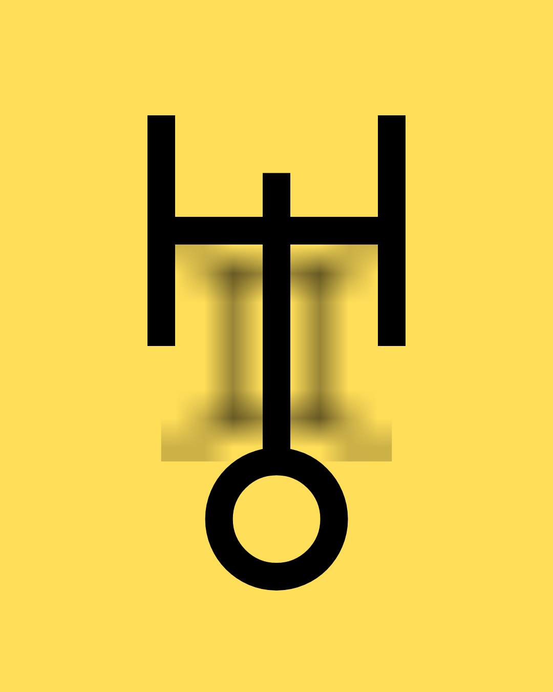 - The glyph for the planet Uranus in front of the glyph for the sign Gemini with a yellow backdrop. Photo by Mad Sage Astrology.